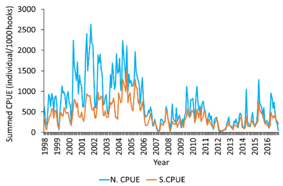 Mature albacore relative abundance was indexed as nominal catch per unit effort (N.CPUE). N.CPUE (per 1000 hooks) was calculated using the following formula: