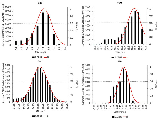 SI values were calculated using the summed frequency distribution of the S.CPUE of each class, and the SI values were assumed to range between 0 and 1. The midpoint of the class interval of each environmental variable was used as the observed value for SI model fitting. Finally, the relationships between the SI and oceanographic variable results were determined using the following formula [44,45,46]: