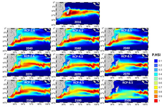 Figure 5 presents the changes in the HSI scores for mature albacore tuna during October–March under various RCP scenarios and at various time points. A high HSI (>0.6) zone was identified between 15° S and 30° S. The predicted latitudinal pattern of the high HSI zone for the year 2040 was nearly identical to that for the year 2016 under all RCP scenarios. For the year 2070, the high HSI zone was situated between 20° S and 30° S under the RCP 2.6 and 4.5 scenarios. The high HSI zone exhibited a slight southward shift in the year 2070. At the end of the year 2100, the high HSI zone remained situated between 25° S and 35° S under the RCP 2.6 and 4.5 scenarios. However, a clear change occurred under the RCP 8.5 scenario; the high HSI zone exhibited a notable southward shift, crossing 35° S in the year 2100 under the RCP 8.5 scenario. Two high HSI zones were identified; one was situated between 20° S and 25° S and 90° E and 100° E, and the other was situated between 25° S and 35° S and 30° E to 40° E.