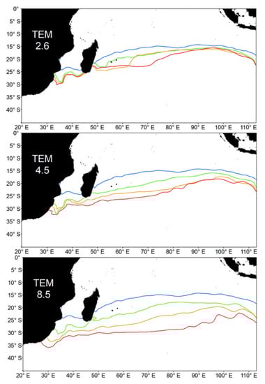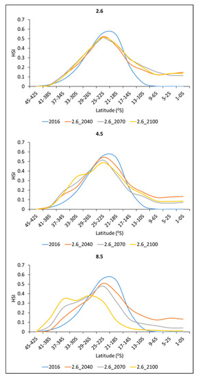 Figure 6 presents the results pertaining to the latitudinal shift in the ensemble HSI score for mature albacore tuna during October–March under various RCP scenarios and at various time points. For the year 2016, the high HSI zone was situated between 18° and 25° S. Under the RCP 2.6 scenario, this zone exhibited a high HSI trend that was mostly similar to that for the year 2016 at three time points; the HSI scores ranged between 0.5 and 0.6. Under the RCP 4.5 scenario, this zone exhibited a high HSI trend that was mostly similar to that for the year 2016 at three time points; the HSI scores were slightly greater than 0.5. In terms of changes that occurred when both scenarios (2.6 and 4.5) and time points (2040, 2070, and 2100) were considered, the HSI score only exhibited a considerable reduction after 25° S. Under the RCP 8.5 scenario, the high HSI zone exhibited a substantial latitudinal shift for the years 2040 and 2070, and the HSI score changed slightly relative to that for the year 2016. However, for the year 2100, the HSI score decreased to nearly 0.4, and the high HSI zone was situated between 25° S and 35° S, indicating an upward latitudinal shift. For the year 2100, the HSI score of the area between 18° S and 25° S was slightly less than 0.4 under the RCP 8.5 scenario, which is lower than the values obtained under the RCP 2.6 (0.5–0.6) and 4.5 (0.5–0.6) scenarios. This finding indicates a notable shift in the high HSI zone is likely to occur in the year 2100 under the RCP 8.5 scenario. Figure 7 represented the latitudinal changes of the 27.5 °C isotherm line under various climate change scenarios.