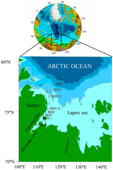 The largest continental shelf areas of the world are located in the Siberian Arctic; they are impacted by large volumes of fresh water from Siberian river basins, which transport a high amount of organic matter and nutrients into the Arctic Ocean. The Laptev Sea annually receives 820 km3 of river runoff, the second-highest (after the Kara Sea) freshwater contribution to the Arctic seas [28,29]. The Khatanga River is the second-largest river flowing into the Laptev Sea, with an annual runoff of 105 km3. The suspended particulate matter (SPM) concentration in the Khatanga River reaches 140−170 g m−3. The freshwater runoff of the Khatanga River is small; despite this, the plume formed by this runoff has an anomalously large area, similar to that of the Ob and Yenisei plumes [30].