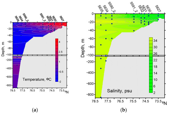 At stations 5591-2, 5590-2, and 5634 located on the Western shelf (WS), the water temperature on the surface in the south–north direction decreased from 2.3 to −0.4 °C, while salinity, conversely, increased from 22.5 to 30.0 psu. At all stations, the water temperature near the bottom was negative: from −0.9 to −1.7 °C; salinity varied from 33.5 to 34.6 psu.