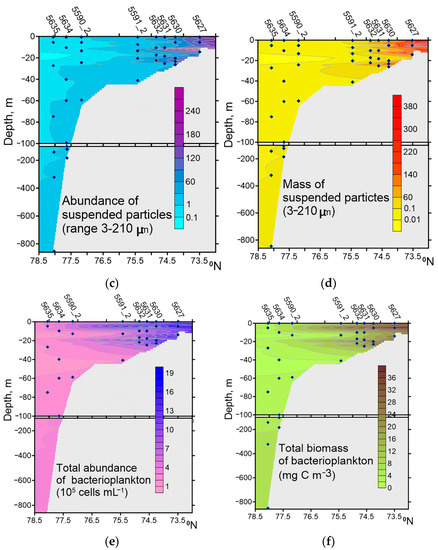 The waters of KHAB, which receives Khatanga River runoff, contained a large amount of DAPI-positive yellow suspended particles (DYP) [38]. The abundance of DYP 3–210 μm in size (NP) in the KHAB water column varied within (19.3–282) × 103 particles mL−1, averaging (139.0 ± 33.1) × 103 particles mL−1 (Figure 2). The mass of DYP 3–210 μm in size (MP) in the KHAB water column varied within 9.08–380.08 g m−3, averaging 158.12 ± 46.1 g m−3 (Figure 2).