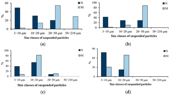 Proportion (%) of different size classes of suspended particles with attached bacteria in the total number (N) and mass (M) of suspended particles with attached bacteria in the water column of (a) Khatanga Bay, (b) transition zone, (c) Western shelf, and (d) continental slope of the Western Laptev Sea.