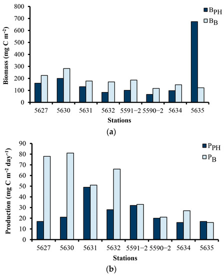 Comparison of biomass and production of phytoplankton and bacterioplankton. (a) phytoplankton (BPH) and bacterioplankton (BB) biomasses (mg C m−2) integrated in the photic zone; (b) phytoplankton (PPH) and bacterioplankton (PB) production (mg C m−2 day−1), integrated in the photic zone.