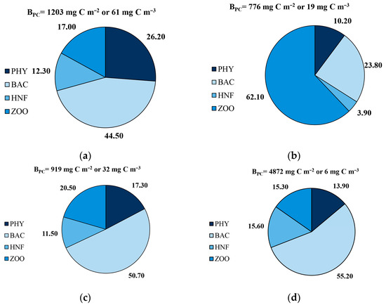 Proportion (%) of phytoplankton (PHY), bacterioplankton (BAC), heterotrophic nanoflagellates (HNF), and zooplankton (ZOO) in the total plankton community biomass (BPC, mgC m−2 or mgC m−3) in (a) Khatanga Bay, (b) transition zone, (c) Western shelf, and (d) continental slope of the Western Laptev Sea.