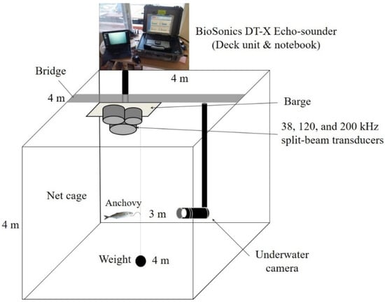 The TS measurements were carried out using a scientific echo-sounder (DT-X; BioSonics, Inc., Seattle, WA, USA). The three split-beam transducers with frequencies of 38, 120, and 200 kHz were installed 0.5 m below the sea surface within a net cage, facing downward in the vertical direction. The experiments were conducted under specific environmental conditions, including a seawater temperature of 16.17 °C, salinity of 33.25 psu, and a sound speed of 1508.38 m/s [11].