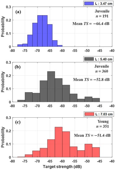 Target strength (TS) histograms for anchovies with total length (L) at 200 kHz for (a) juvenile (L = 3.47 cm), (b) juvenile (L = 5.40 cm), and (c) young (L = 7.03 cm) stages.