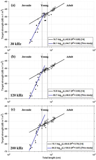 Relationship between the mean target strength (TS) and total length (L) of Japanese anchovies at (a) 38, (b) 120, and (c) 200 kHz. Black circle points are the results of the present study, and black square points are the results of our previous study [14]. The black and blue solid lines represent the fitting TS equations.
