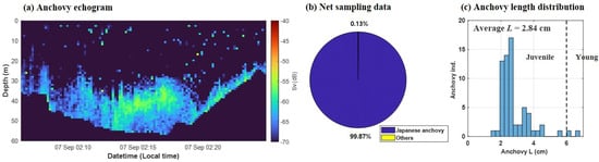 (a) Sample echogram of the anchovies, (b) net sampling data, and (c) anchovy total length (L) distribution acquired from the net sampling data.