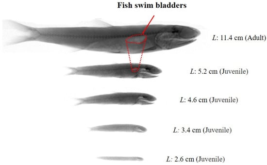 More than 90% of the TS was found to be associated with the swim bladder size [11]. Similar to the growth curve of human lungs, the growth curve of fish swim bladders also varies with age and size. To verify the presence of swim bladders in anchovies at different L values, we utilized soft X-ray radiography on additional anchovy samples. The results revealed that swim bladders were observed in anchovies with L values greater than 5.2 cm, but they were not observed in anchovies with L values less than 4.6 cm (Figure 7). This indicates that the presence and development of swim bladders are closely related to the size of the anchovies. The observed low TS value in juvenile anchovies can be attributed to the small or immature size of their swim bladders. Previously, information on swim bladders in juvenile anchovies with L < 5.0 cm has been scarce [26]. However, the TS values and images obtained in our study demonstrated that the TS is intricately linked to the growth of anchovies and undergoes changes based on their developmental stage and swim bladder size. The correlation between swim bladder development and TS values reinforces the importance of considering the growth stages and swim bladder size when estimating the TS of anchovies. Such insights will lead to more accurate biomass estimations and improve our understanding of the dynamics of anchovy populations in different stages of development.