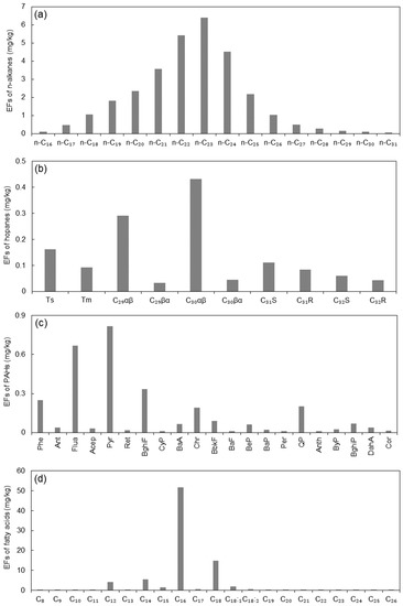 - Schauer, J.J.; Kleeman, M.J.; Cass, G.R.; Simoneit, B.R.T. Measurement of emissions from air pollution sources. 2. C-1 through C-30 organic compounds from medium duty diesel trucks. Environ. Sci. Technol. 1999, 33, 1578–1587. [Google Scholar] [CrossRef]