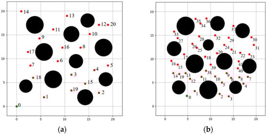 Information on obstacles and suspected target points in the mission sea area have been obtained by other reconnaissance methods. Considering that UUVs often operate at a fixed depth underwater in real scenarios, this study simplifies the path planning problem for mine countermeasure UUVs dealing with multiple ground mines, establishing a two-dimensional feature map to abstractly represent the mission sea area. The feature map displays the starting point (green point), suspected target points (red points), and obstacle circles (black circles) of the UUV entering the mission sea area, along with their size information in the global coordinate system. The obstacle circles are circular expansions based on the circumscribed circles of irregular polygonal obstacles, with an expansion radius Rp equivalent to the UUV’s width. According to the above rules, two task scenarios are constructed as shown in Figure 1.