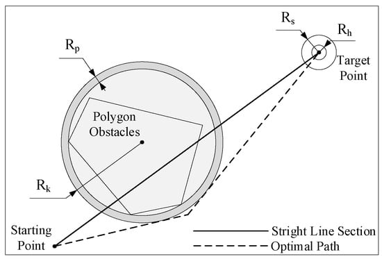 In Equation (2), denotes the coordinates of the i-th suspected target point, represents the disposal operation radius, and signifies the sweep operation radius. Below is an illustrative diagram depicting the UUV avoiding obstacles and entering the operational radius (Figure 2):