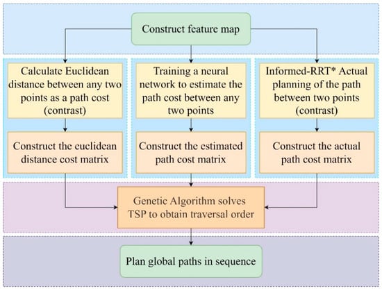 In this study, for the stage of constructing the path cost matrix, we have trained a path cost estimation neural network to estimate the cost of the path planned by the Informed-RRT* algorithm in an obstacle environment. The comparison experiments with the actual path cost matrix input and the Euclidean distance cost matrix indicate that this method improves the speed and accuracy of calculating the path cost matrix, providing a new approach to enhance the efficiency of the multi-target path planning algorithm. The overall framework of the algorithm is as follows (Figure 3).