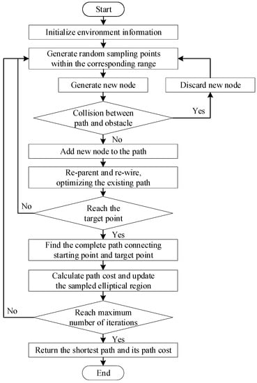 The Informed-RRT* algorithm is an improvement of the RRT* algorithm []. It inherits the asymptotic optimality of the RRT* algorithm, and has strong search capability and fast planning speed. It replaces the global uniform sampling with elliptical sampling, effectively improving the sampling efficiency []. The flowchart of the Informed-RRT* algorithm is shown in Figure 4. In the first iteration of the Informed-RRT* algorithm, the cost of the path obtained by the global uniform sampling of the RRT* algorithm is used as the long axis length, the starting point and the target point are the foci, and the Euclidean distance between the two points is the focus distance, forming the original elliptical sampling area. Subsequent iterations are planned within the original elliptical sampling area. If a shorter path is obtained, the path cost currently updates the length of the ellipse’s long axis, resulting in an elliptical sampling area with a larger eccentricity and smaller area. The iteration continues in the updated ellipse until the maximum number of iterations is reached.