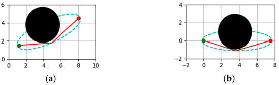 Suppose that the line connecting the start point and target point intersects with m obstacle circles. Based on the value of m, datasets are created correspondingly. For example, in the case of m = 1, as depicted in Figure 5a, the sampling ellipse area is obtained by calculating the ellipse with the left focal point at the origin and the right focal point on the positive half-axis of the x-axis, followed by a series of rotations and translations. To facilitate parameter adjustment, the origin can be fixed at the origin, and the target point can be set on the x-axis, as illustrated in Figure 5b. Through multiple nested loops, parameters such as the coordinates of the center of the obstacle circle, the radius of the circle, and the horizontal coordinates of the target point are altered in certain steps, simulating various scenarios where the planned path avoids the obstacle circle.