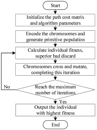 Currently, the main algorithms for solving the TSP include the Guo Tao algorithm [], simulated annealing algorithm [,,], ant colony algorithm [,], etc. Genetic algorithm [] can escape from local optima through mutation operator, showing strong reliability. In this algorithm, the integer represents the gene coding from the starting point to the i-th target point. The order of traversing the target points corresponds one-to-one with the gene order of the chromosome. The total path cost of the traversal order represented by each chromosome serves as the fitness function. The smaller the total path cost, the higher the fitness. By setting parameters such as population size, iteration times, crossover probability, mutation probability, etc., the initial population is randomly generated, the fitness of individuals in the population is calculated, individuals with low fitness are eliminated, and the highest fitness individuals are cloned to fill the population. After performing chromosome crossover, mutation, and other operations on the new population individuals with a certain probability, an iteration is completed. This process is repeated until the maximum number of iterations is reached. The individual with the highest fitness is output, and the optimal traversal order is obtained. The algorithm flowchart is as follows (Figure 8).