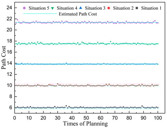 Due to the sampling principle of the Informed-RRT* algorithm, multiple planning results under the same scenario have a degree of uncertainty. In contrast, the trained network gives a constant output for a given input. To verify the reliability of the path cost estimation neural network, five scenarios were randomly selected from the test set. In each scenario, the Informed-RRT* algorithm was invoked to plan 100 times, and the actual path costs were recorded. These were then compared with their path cost estimates, as shown in Figure 9.
