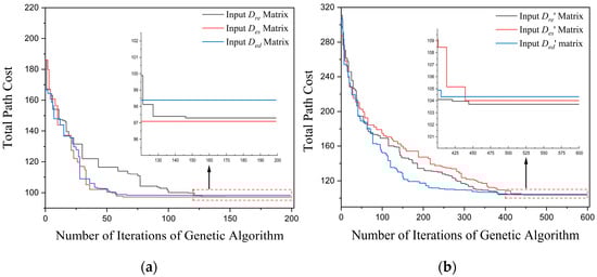 For task scenarios A and B, input three types of cost matrices, respectively, and use the genetic algorithm to solve the TSP to obtain the traversal order that minimizes the total path cost; the iteration process of the genetic algorithm is shown in Figure 10.