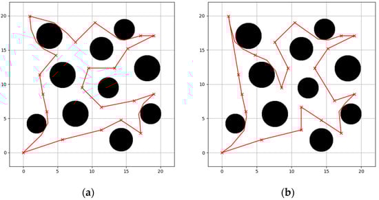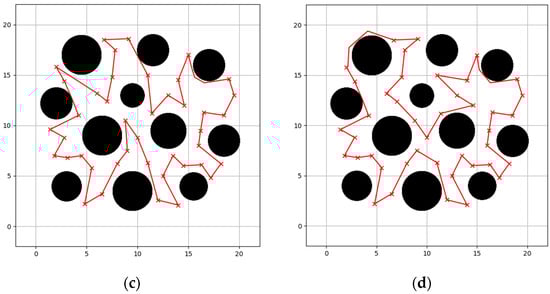 Based on the traversal order obtained in Section 4.2, the Informed-RRT* algorithm is employed to plan the optimal global path from the starting point, through all the target points in order and back to the starting point. If the direct line segment between two adjacent target points in the traversal order does not intersect with any obstacle circles, that line segment can be used directly as the path between these two points, with the path cost equal to the length of the line segment. Experiments show that this method can further reduce the total path cost and improve the speed of global planning. The global paths planned for the four traversal orders in both task scenarios are shown in Figure 11.