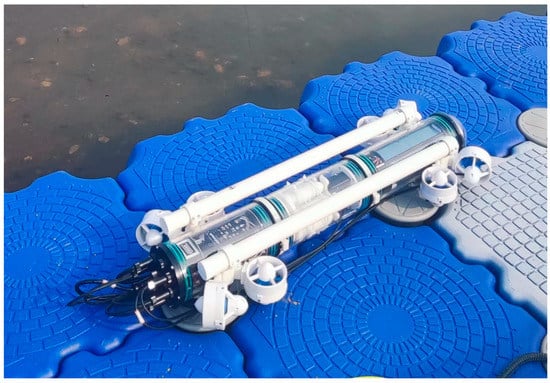 The UUV has eight thrusters, which can realize closed-loop control of four degrees of freedom movement, including rising and sinking, moving forward and backward, moving left/right, and turning in place. The device is structured in three sections, consisting of a battery compartment, payload compartment, and control compartment. The control compartment integrates the flight control system and payload control system and is connected to a communication buoy by a buoyancy line. The relevant technical parameters are shown in Table 5.