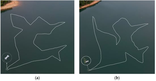 Water surface navigation test of UUV (a) Aerial view of order 1 in scenario A; (b) Aerial view of order 2 in scenario A.