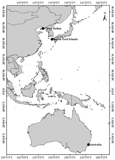 We assessed five collections of yellowtail kingfish from China (wild and farmed), Japan (wild), and Australia (wild and farmed) (Figure 1): wild yellowtail kingfish (n = 33) from the Yellow Sea, off the coast of Dalian, China (39°57′ N, 123°04′ E); F1 generation yellowtail kingfish (n = 30) were provided by the Dalian Fugu Food Co., Ltd. (Zhuanghe, Dalian, China); wild yellowtail kingfish (n = 20) were collected off the Gotō Islands, Japan (32°45′ N, 128°27′ E); wild yellowtail kingfish (n = 29) were collected from the Tasman sea off of New South Wales, Australia (33°44′ S, 151°45′ E); and F2 generation, farmed yellowtail kingfish (n = 31) were provided by the South Australian Department of Primary Industries and Regions. Pectoral fin clips were collected from the wild and farmed fish from China and Australia; the fin tissues were immersed in 95% ethanol and stored in a refrigerator at 4 °C before genomic DNA was extracted. Genomic DNA from the fin clips of wild fish from Japan was provided by a collaborator at the University of Tokyo.