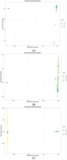 The ADMIXTURE cross-validation error levels indicated that the most likely number of subpopulations (parameter K) was 2 (Figure S1). When K = 2, the Australian wild and farmed collections are grouped together in one cluster, while the Chinese wild and farmed collections, as well as the Japanese wild collections, form another cluster. When K = 3 or K = 4 (Figure 2B,C), individual outliers from the cultured population cluster separately within the Australian and Chinese farmed collections, but did not show distinct separations. Based on the current analysis, the origins of the Chinese and Japanese populations are similar, while the Australian collections origins are different (Figure 2A). Similarly, our PCA showed that the Chinese and Japanese collections clustered together, distinct from the Australian cluster (Figure 3A); PC1 and PC2 explained 41.16% and 3.73% of the variance across populations, respectively. On PC1, there were individual outliers within the wild Australian collection. PC3 revealed a weak clustering pattern in the Australian cultured collection, and PC3 explained only 1.26% of the variance across populations (Figure 3B). Similarly, PC4 indicated a weak clustering pattern in the Chinese cultured collection, and PC4 explained only 1.16% of the variance across populations (Figure 3C).