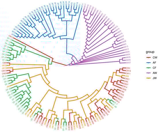 Neighbor-joining phylogenetic tree of the five yellowtail kingfish collections. Notes: The reliability of the phylogenetic tree was assessed using the bootstrap method with 1000 replicates. Branch lengths reflect the genetic distance. A Japanese wild collection (JW), Chinese farmed collection (CF), Chinese wild collection (CW), Australian farmed collection (AF), and Australian wild collection (AW).