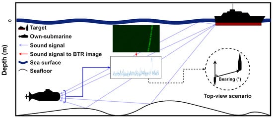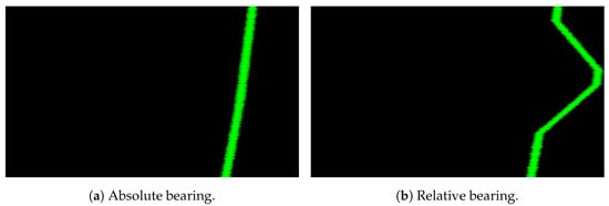 In the context of target tracking, two types of BTR images were generated with absolute and relative bearing information. The bearing represents the 2D plane angle of the enemy ship as observed from the top view (see Figure 2). A relative bearing represents the angle relative to the heading of one’s own submarine. On the other hand, an absolute bearing represents the angle with respect to north as the 0° reference point. Two different types of bearing are illustrated in Figure 6, and the movement of one’s own submarine is reflected in (b).