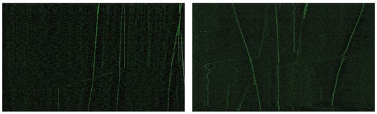 In previous studies, traditional image processing methods have been utilized to extract or segment objects from SONAR images [,]. Although these algorithms can extract targets from noisy images, they lack the experiments to validate whether the methods can segment a continuous target object from a discrete source object. In this paper, we propose a deep-learning-based segmentation network that can extract targets as a continuous form, even from discontinuous and noisy BTR images. The network’s objective is to learn how to predict a continuous target trajectory from an input image with a discontinuous target trajectory in a supervised learning manner using noisy BTR images and their corresponding label images.