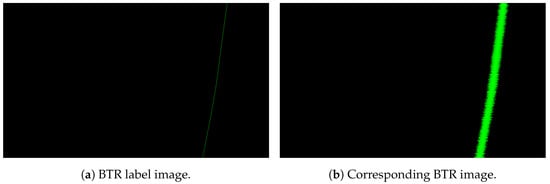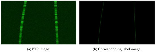 An example of a BTR label image and a BTR test image is presented in Figure 5, where the BTR label image contains absolute bearing information in one motion with 100% PD and no noise. To be more specific, simulated BTR images (Figure 5b) with dimensions of 1200 × 700 were generated. The horizontal axis represents bearing information ranging from −180° to 180° at an interval of 0.3° per pixel, while the vertical axis represents time information, where per second images are captured in order from top to bottom. The bit depth of a pixel is 8 bits, representing brightness values ranging from 0 to 255. It should be noted that the corresponding label images (Figure 5a) have a binary pixel value, where the target’s bearing information is represented by 255, while non-target areas have a value of 0. BTR label images have only one non-zero pixel in each row as bearing information. However, actual measurement images tend to display the target trajectory with a certain thickness, caused by several noise factors, as depicted in Figure 5b. To account for this, we simulated the trajectory of target bearing information in the horizontal direction using Gaussian modeling as follows: