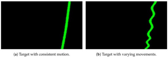 To reflect diverse challenges encountered during target tracking, the BTR images were produced in two distinct formats. The first type of BTR image portrays the target’s bearing trajectory as a simplistic straight line, assuming a constant motion of the enemy ship without any deviation from its path (Figure 7a). The second type of BTR image incorporates more varying target movements in the form of sinusoidal oscillations along the vertical axis (Figure 7b).