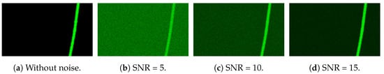 To simulate background noise in BTR images, the additive white Gaussian noise (AWGN) function was utilized, with four noise levels applied in terms of the signal-to-noise ratio (SNR). These SNR values included 5, 10, and 15, with a no-noise scenario also considered. As the SNR decreases, the degree of noise increases. An example of a BTR image with background noise is demonstrated in Figure 8.