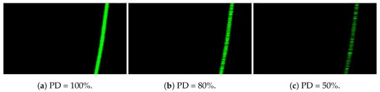 The BTR dataset was designed to accommodate intermittent target measurements by incorporating three distinct probabilities of detection (PD): 50%, 80%, and 100%. The term PD refers to the likelihood of target detection per frame, with 100% indicating the availability of target bearing information across all frames. Visual representations of BTR images with different PD values are shown in Figure 9.