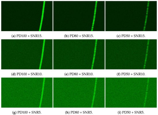 For learning and experimentation purposes, the BTR images without noise were excluded. Thus, nine BTR images were generated by combining three different levels of noise and three different PD values for each case, as depicted in Figure 10.