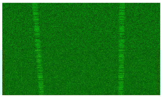 where represents the values of the pixels that are generated in Figure 5b based on the bearing information of the target in Figure 5a, and corresponds to the bearing value of the target in Figure 5a and has a pixel value of 255. In order to enhance the similarity to real BTR images, where the thickness of the target trajectory varies at each time step, we simulated the thickness using a Gaussian model with a random selection of values for each time step. Therefore, pixel value of the object in Figure 5b is attenuated as deviates from the bearing position.