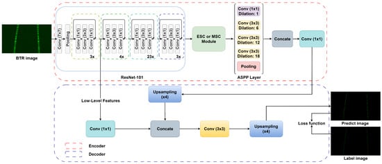 As shown in Figure 12, the input image proceeds through the initial stage of feature extraction by the ResNet-101 backbone network []. The resulting feature map, which is reduced in spatial size by a factor of 1/16, is subsequently fed into the MSC (or ESC) layer. The ASPP layer then employs kernels with varying scaling ratios to aid in extraction of targets with different widths per row in the BTR image. After the ASPP layer, a 1 × 1 convolution is utilized to reduce the number of channels, followed by a 4× upsampling process that aligns it with the low-level features from ResNet-101, which have also undergone a 1 × 1 convolution. Subsequently, a 3 × 3 convolution takes place, followed by a 4× upsampling operation, resulting in a segmented image with the original image resolution.