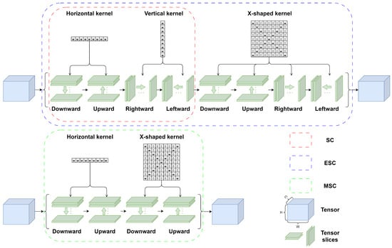 The ESC and MSC modules shown in Figure 13 can make the SC module proposed in [] more well-suited to the distinct characteristics of BTR images. Specifically, the ESC is a module that adds additional sublayers to the existing SC layer module. In the sublayers, the convolution operation is performed four times with an X-shaped kernel, in the order of downward, upward, rightward, and leftward directions. The MSC comprises a series of downward, upward, downward, and upward sublayers with the horizontal kernel and X-shaped kernel, respectively. Each sublayer of the ESC and MSC modules maintains a tensor size consistent with both its input and output.