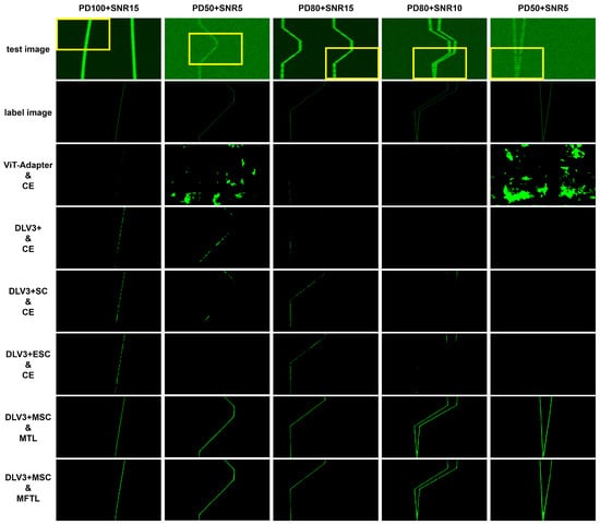 When comparing the results of the first and third columns, which were tested on images with low noise and high PD, the DLV3+ based models show a certain degree of target segmentation, but a considerable amount of fragmented areas are also observed. In contrast, the Vit-Adapter model exhibits lower segmentation results. However, it is evident that the results of the proposed DLV3 + MSC using the MTL and MFTL loss functions show significantly fewer discontinuous regions.