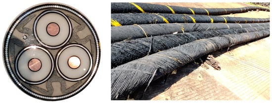 Along with the increase in the installed capacity of offshore wind power [,], the number of submarine cables has also increased rapidly as the main power transmission equipment of offshore wind power []. Until 2019, the total length of global submarine cables exceeds 1.2 × 106 km []. Compared with the single-core submarine cable, the three-core submarine cable can save laying area and increase transmission capacity, as shown in Figure 1. At the same time, it has the advantage of reducing loss and is widely used for coastal island power supply and offshore wind farm power transmission [].