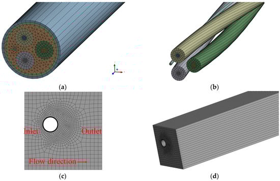 Schematic diagram of mesh: (a) meshing of the submarine cable model; (b) meshing of the torsional structure; (c) meshing of the fluid domain cross-section; (d) meshing of the fluid domain.