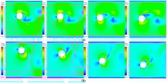 According to the fluid–structure interaction simulation results, the vortex discharge nephograms at different times under the two flow velocities are shown in Figure 4. It can be seen from the figure that in the process of vortex discharge, the flow velocity on the upper and lower surfaces of the submarine cable is large. When the velocity is 1.5 m/s, the vortex discharge is relatively smooth, and when the velocity is 2.5 m/s, the vortex discharge is more rapid, and the wake flow becomes unstable.