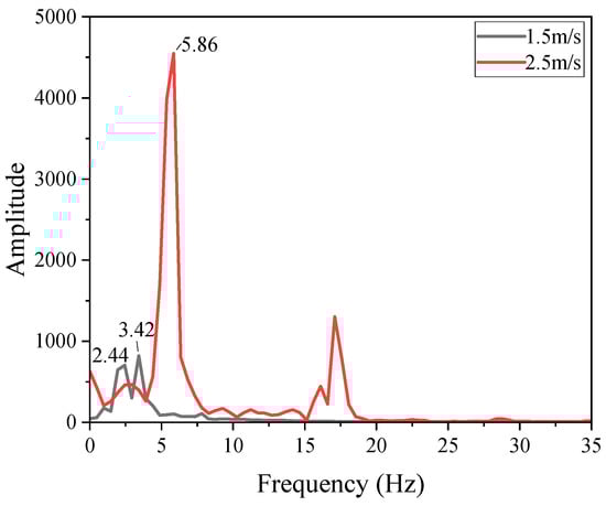 To study the frequency of vortex discharge at different flow velocities, Fourier analysis was performed on the lift coefficient curve obtained from the calculation results, and the frequency distribution is shown in Figure 5. Since the lift coefficient itself is a dimensionless parameter, the amplitude in Figure 5 has no unit. It can be seen from the figure that the frequency of the lift coefficient exhibits a maximum peak at about 5.86 Hz for a velocity of 2.5 m/s. When the flow velocity is 1.5 m/s, the phenomenon of beat vibration appears [] and the frequency peaks are 2.44 Hz and 3.42 Hz, respectively. It shows that the frequencies of vortex-induced lift acting on the submarine cable are 5.86 Hz, 2.44 Hz, and 3.42 Hz.