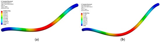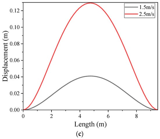 To observe the displacement distribution, the total displacement distribution nephogram of the vortex-induced vibration of the submarine cable model is extracted as shown in Figure 6a,b. From the figure, it can be observed that under the action of water flow with velocities of 1.5 m/s and 2.5 m/s, the submarine cable is displaced due to vortex-induced vibration. Specifically, the displacements are symmetrically distributed about the middle position, which is similar to the first and second-mode shapes.