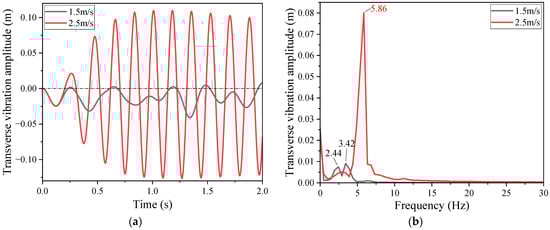 The time-domain curves of the transverse vibration amplitude for the submarine cable model for flow velocities of 1.5 m/s and 2.5 m/s are extracted and shown in Figure 7a. It can be observed that the transverse vibration amplitude at the flow velocity of 1.5 m/s exhibits no apparent regularity over time. However, due to the gravity being greater than the vortex-induced lift, the transverse vibration amplitude at this velocity is primarily negative, with a maximum amplitude of 0.375 D. In addition, at the velocity of 2.5 m/s, the transverse vibration amplitude of the submarine cable model increases first and then stabilizes gradually with time. Under the action of gravity, the positive peak is slightly smaller than the negative peak, and the maximum vibration amplitude is 1.156 D. Comparing the variation amplitudes at the two flow velocities, it can be noted that the submarine cable model at the velocity of 2.5 m/s reaches the state of vortex-induced resonance, resulting in a locking phenomenon and a sharp increase in transverse amplitude. Therefore, vortex-induced vibration significantly affects the submarine cable in the transverse direction.