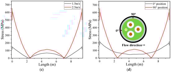 Furthermore, the stress distribution curves of the armor layer at different flow velocities are extracted along sampling paths. It can be seen from Figure 8c that the armor layer bears the maximum stress at the suspension points at both ends of the submarine cable, and the middle position also has a smaller peak stress due to the maximum displacement.