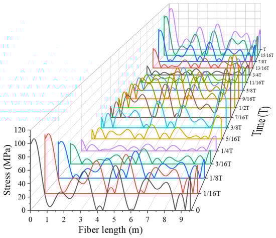 In this study, the vibration cycle is set from when the transverse amplitude of the submarine cable reaches its positive peak value to the next time it reaches its positive peak value. To investigate the stress distribution and its development law of the torsional optical fiber during vortex-induced vibration in the submarine cable, the stress along the torsional optical fiber at different times is extracted, and the fiber length–time–stress distribution curve is plotted.