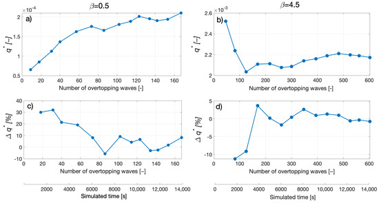 Figure 2 shows the variation of the estimated mean overtopping discharge against the simulation length and against the number of overtopping waves when the value of is 0.5 (a) and when the value of is 4.5 (b). The corresponding percentage variations are also shown when (c) and when (d).